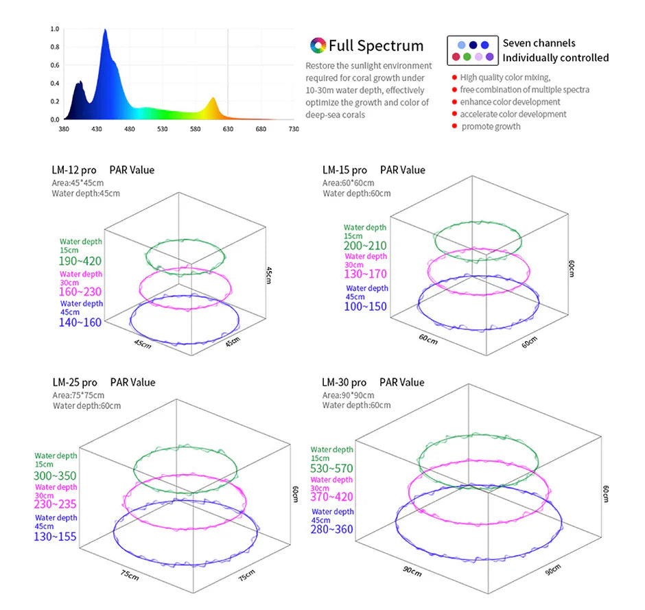 - Full spectrum, 7 unique band channels for maximum coral coloration