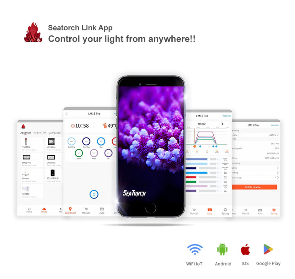 The Seatorch LM30 is a 240W, high intensity LED aquarium light, designed to achieve a beautiful coral reef. Features a full range of individually adjustable color channels, that can be accessed via the Seatorch app. Best bang for your bucks!!!